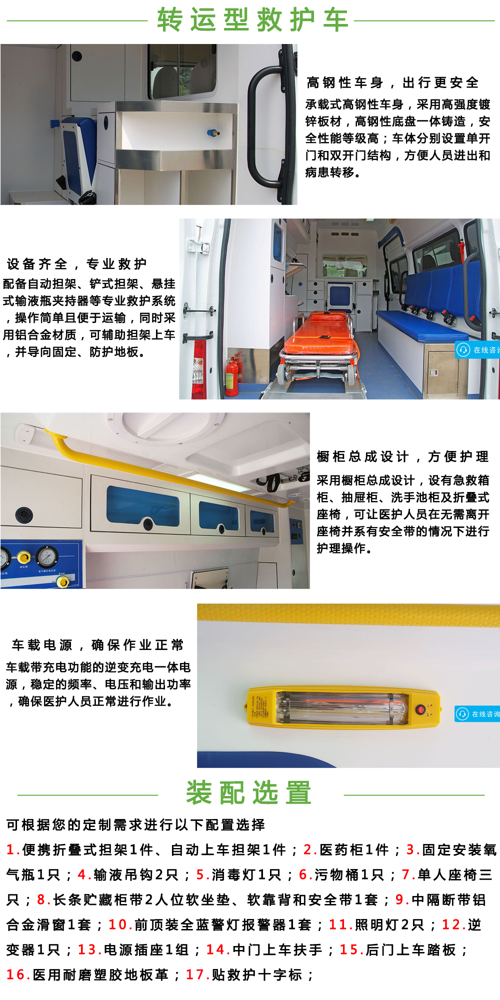 該車配備醫(yī)療器械柜,氧氣瓶,擔(dān)架,消毒燈,特種車輛標(biāo)志燈及**報器等專用裝置.選裝車頂前額位置特種車輛標(biāo)志燈時高度分別為2580mm,2590mm,2685mm.ABS系統(tǒng)**器型號:6C11 2M110 A*;ABS系統(tǒng)**器生產(chǎn)企業(yè):博世汽車部件(蘇州)有限公司;發(fā)動機(jī)**大凈功率99kw. | |||