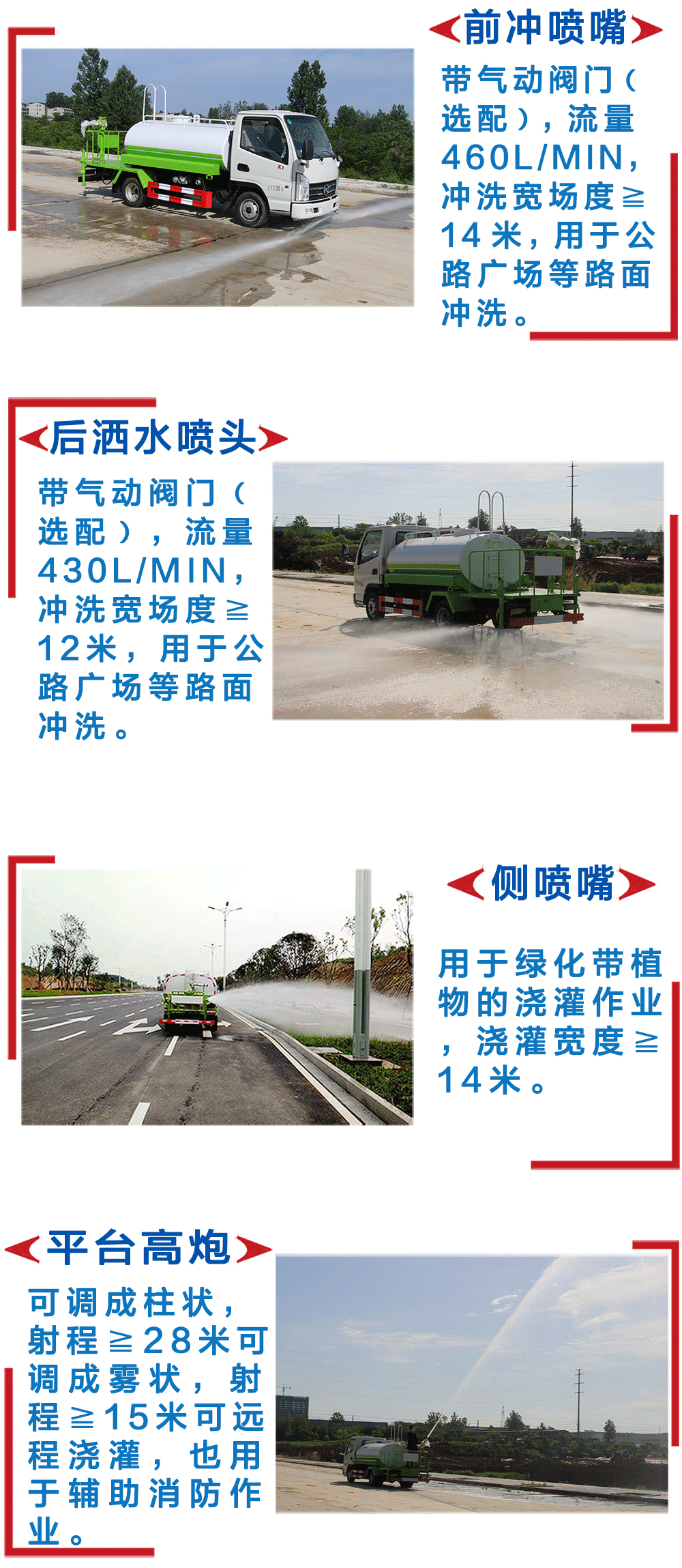 灑水車(chē)又稱(chēng)為噴灑車(chē)、多功能灑水車(chē)、園林綠化灑水車(chē)、水罐車(chē)、運(yùn)水車(chē)。 灑水車(chē)適合于各種路面沖洗,樹(shù)木、綠化帶、草坪綠化,道路、廠礦企業(yè)施工建設(shè),高空建筑沖洗。具有灑水、壓塵、高、低位噴灑,農(nóng)藥噴灑、護(hù)欄沖洗等功能,還具有運(yùn)水、排水,應(yīng)急等功能。