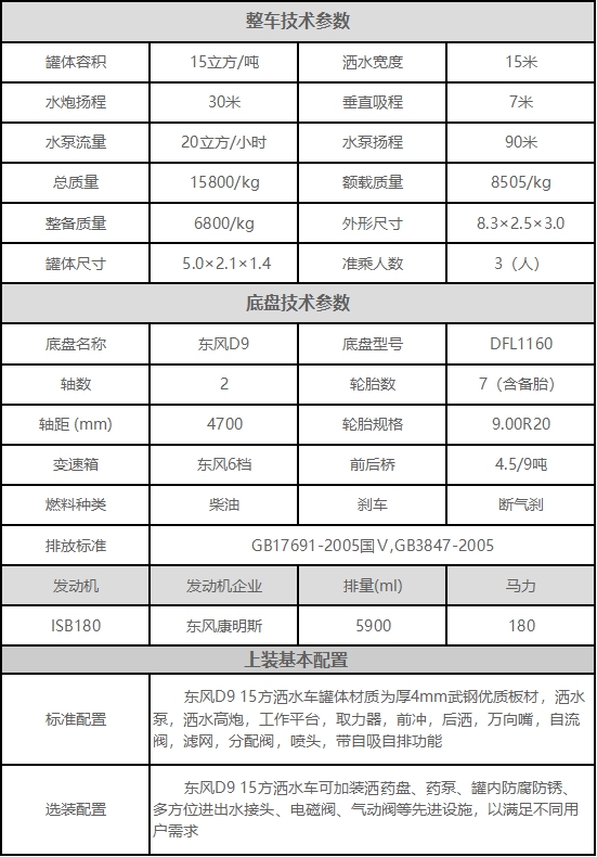 3950軸距 玉柴200馬力/康機210馬力, 2315/排半,法士特6檔變速箱,295/80R22.5,前后橋3.9/8德納,250雙層車架,動轉,離合助力,電動門窗中空鎖,空調,斷氣剎,排氣制動,ABS ,采用大流量水泵,大通徑球閥、基本灑水功能前沖、后灑、側噴、工作平臺帶軸承高炮(可調節(jié)成霧狀、直柱狀)、可泵進泵出、罐體兩側圓形炮筒、帶兩根抽水軟管,(尾部可加裝30米霧炮機組)