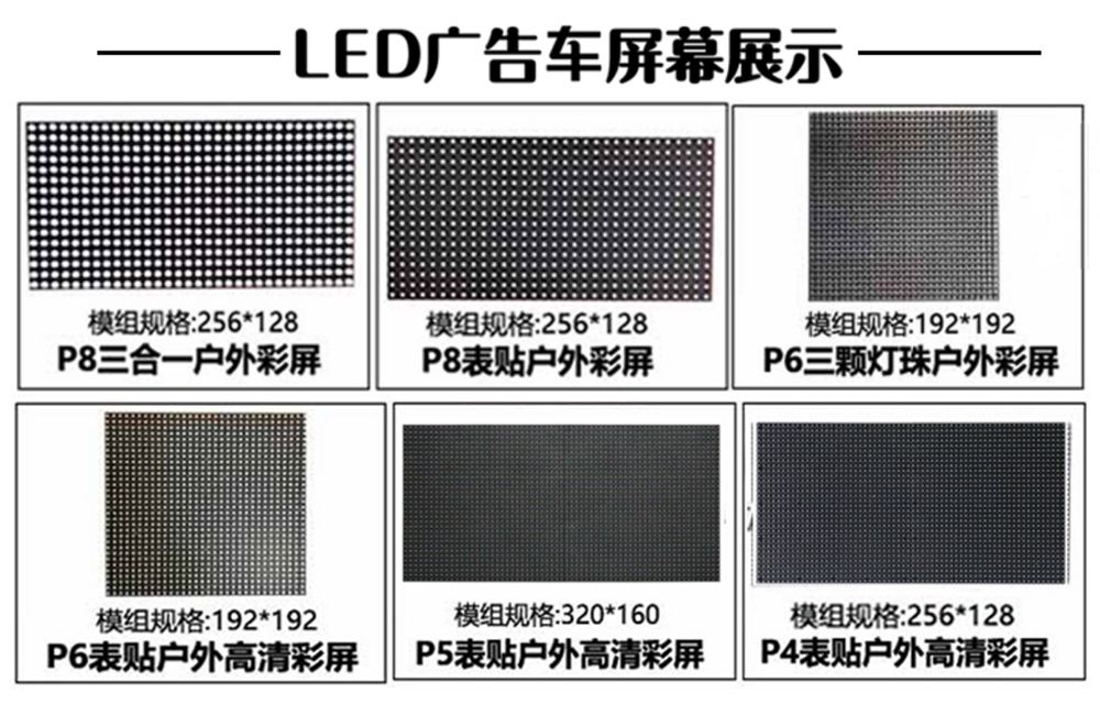 廣告車選裝配置:客戶可根據(jù)需求選裝屏幕清晰度(P10彩屏、P8彩屏、P6彩屏、P5彩屏、P4彩屏)、單面彩屏、